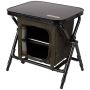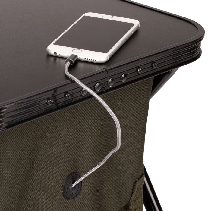 Die kleine Station mit Doppelregal und Tisch klappt sich einfach zusammen. Mit der speziellen Tischplatte, haben Sie die ideale Arbeitsfläche zum Essen, zum Bauen und binden oder um im inneren Empfänger, Powerpacks und Handys zu lagern. Das verstellbare, drehbare Gestell sorgt für eine stabile Unterstützung für den Tisch sowie für die Balance auf unebenem Gelände. Das Innenfach bietet an drei Seiten Zugang zum Inhalt mit Reißverschluss und wird mit Klettverschluss und elastischen Knebelverschlüssen befestigt.