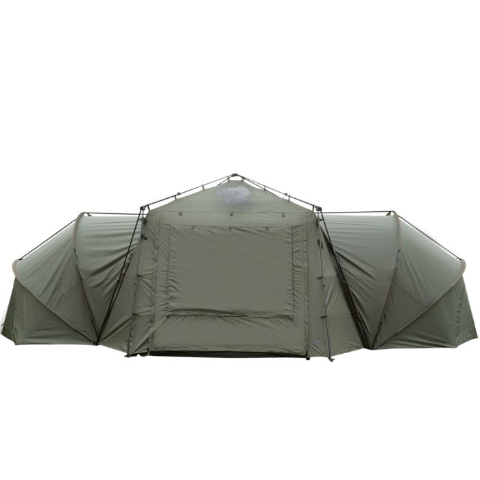 Bivvies im Pram-Hood-Stil können rasch und einfach an den Seiten vom Gazebo angezippt werden – sie bilden eine komplett wasserdichte Verbindung zu zwei separaten Schlafkabinen. Schlafbereiche und ein zentraler Aufenthaltsbereich zum Kochen, Rig-Binden, Essen oder zum geselligen Zusammensitzen.