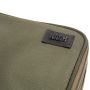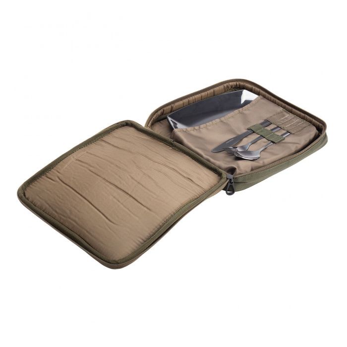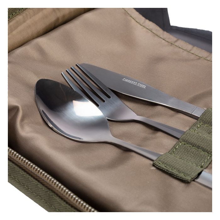 Die stilvolle Tasche in Karpfengrün öffnet sich mit einem Reißverschluss und präsentiert Ihr Besteck makellos, drei Gummizüge helfen, Messer, Gabel und Löffel zu sichern. Unter dem Besteck befindet sich ein weiteres Fach, in dem ein quadratischer Melaminteller untergebracht ist und dort auch zusätzlichen Platz für Gewürze und/oder Portionsbeutel bietet.