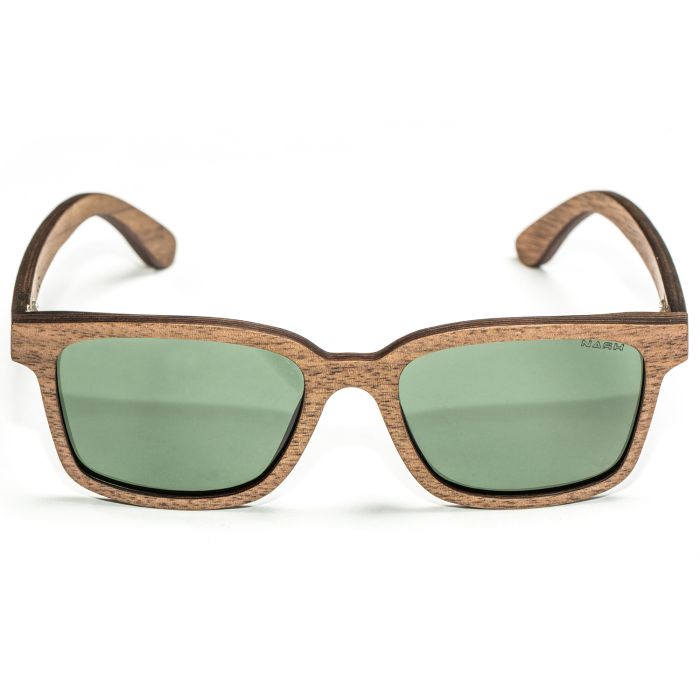 Die Nash Timber Sonnenbrille ist im klassischen Wayfarer-Stil gestaltet, die grünen Gläser sind in einem klassischen Nussbaumrahmen eingesetzt, dessen Kontrast zu einer markanten und stilvollen Premium-Sonnenbrille führt.