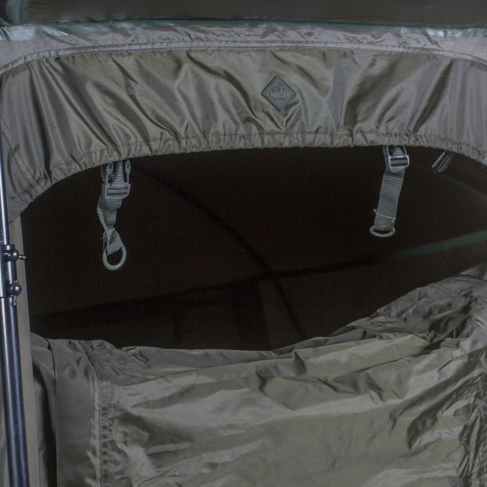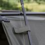 Interne Haken neben dem Block helfen beim Aufhängen von Lampen usw. und zwei Rutenhalterungen mit Zipp-Bändern unterstützen die Ruten wenn sie nicht gebraucht werden. Die Tür aus Netzmaterial kann im Briefkastenstil geöffnet werden denn es ermöglicht ein Öffnen der Tür bei gleichzeitigem Schutz durch das Vordach. Die Eingangstür kann auch durch Storm-Poles abgespannt werden – diese Erweiterung gibt extra Raum und die Bodenplane hat Gummizüge für korrekte und einfache Positionierung
