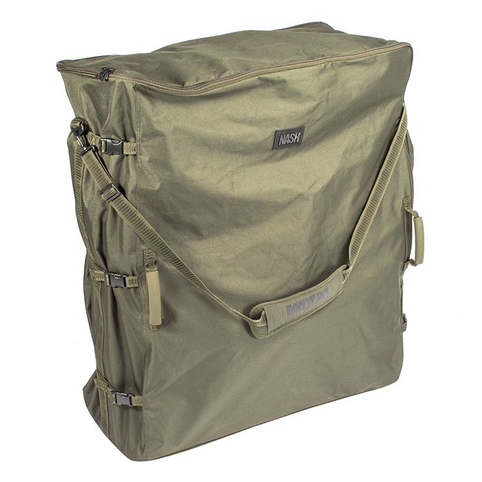 Obwohl viele Schlafsessel jetzt so gebaut werden, dass sie sehr leicht oder kompakt zusammengefaltet aufbewahrt werden können, kann es immer noch recht umständlich sein, vom Auto zum Ufer zu gelangen. Mit der Nash Bedchair Tasche können Sie Ihren Liegestuhl vor Beschädigungen, hauptsächlich am Scharniermechanismus, schützen und die Haltegriffe zum Be- und Entladen auf Ihrer Angelkarre benutzen.