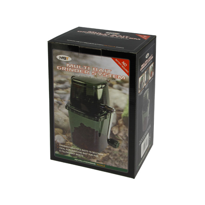 Das Multi Bait Grinder System ist ein super praktisches Hilfsmittel wenn man Ködersorten wie Boilies, Partikel oder Pellets in kleine Bröckchen zermahlen möchte. Ideal zum Füllen von PVA Beuteln und Füttern mit Spod. Erfolg garantiert! Dieses Multi-Tool lässt sich sehr einfach bedienen und benötigt keine Batterien. Man füllt das oberste Fach mit der gewünschten Ködersorte und dreht an der Kurbel bis alles schon klein gemahlen im unteren Fach liegt. Wenn man das Futter noch feiner haben will, kann man es mehrfach mahlen, bis es die gewünschte Feinheit hat. Dank des kompakten Formats passt das Grinder System in jede Angeltasche, so dass es bei jeder Session mit ans Wasser kann.