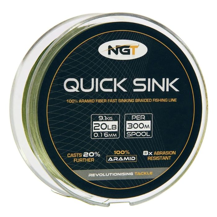 NGT QUICK SINK is the fastest possible sinking braid with the highest possible strength. Made of 100% aramid fiber, it is soft and very strong at the same time. Tests have proven that this line can cast 20% further than other braided lines! This line is a fantastic choice for medium-heavy or heavy feeder fishing. Of course, it can also be used for any type of fishing that requires a very fast sinking or far casting line. 300m of moss green 20lb braid on a spool.