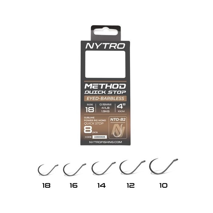 Nytro NTO-B2 Barbless Method Quick-Stop Ready Tied Rigs, The Nytro Method Quick-stop Hooks to Nylon are expertly designed for method feeder fishing and provide a fast, efficient rig option when targeting F1s, carp, big bream or tench. Tied at 10cm and equipped with a quick-stop mounted in a loop, these rigs allow for rapid baiting ideal for soft pellets, corn or meat. Assembled with Sublime Power Rig Mono and the barbless NTO-B2 strong offset circle-type hook featuring an upturned eye, these rigs deliver solid hook-ups and dependable performance straight out of the pack.