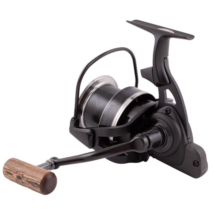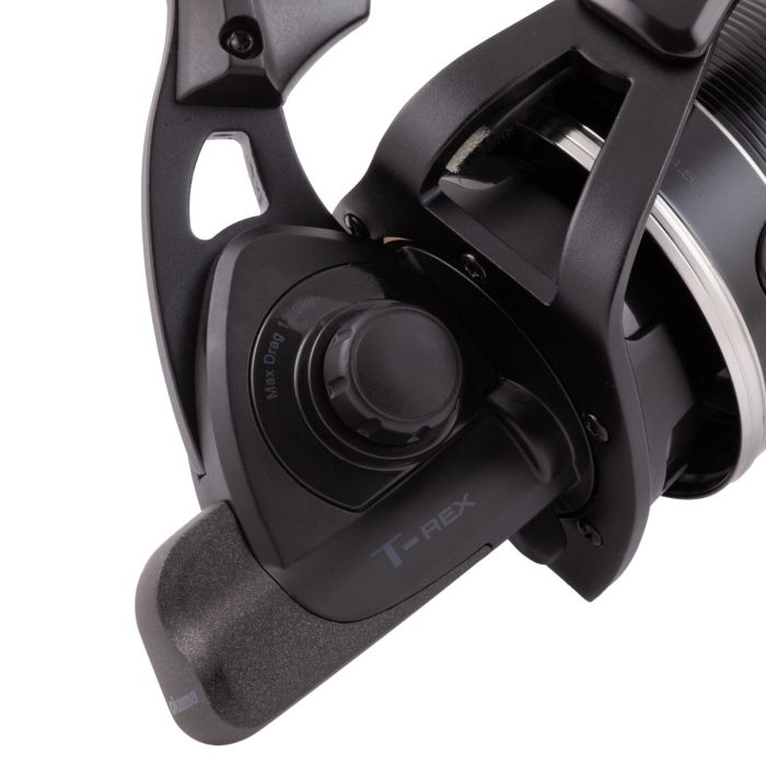 Die Okuma T-Rex Spinn Rolle wurde in der Crossover-Bauweise entworfen denn die leichten Graphitseiten und das Rotorgehäuse sorgen für maximale Festigkeit und minimales Gewicht.. Der Griff ist aus geschmiedetem Aluminium mit Holzknopf. Diese Neue Rolle hat eine quick-set Rücklaufsperre wie viele der Okuma Rollen, und das worm-shaft Übertragungssystem, der Maschinengefräste Messing-Ritzel und die Schnursteuerungsspule, erlauben einen schnell fortschreitenden Luftwiderstand und versichern einen reibungslosen Wurf.
