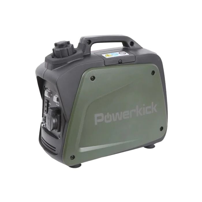 Unser "Powerkick 800 outdoor"-Gerät wurde speziell für Outdoor-Leute, Bootsbesitzer und Karpfenangler hergestellt. Dieser Generator wird in einer speziellen "outdoor" dunkelgrünen Farbe hergestellt. Der Powerkick 800 Outdoor Generator ist ideal für das Aufladen von Batterien, Laptops, iPads, Handys und leichten Haushaltsgeräten, solange die angegebene Leistungsgrenze nicht überschritten wird. Das Modell 800 outdoor hat einen 40 ccm 4-Takt-Benzinmotor mit einer Höchstleistung von 800 Watt. Für den Langzeitbetrieb liegt die maximale Leistung bei 700 Watt. Es handelt sich um ein sehr handliches Gerät (40 x 21 x 36 cm (LxBxH), das 8,5 kg wiegt. Der Benzintank hat ein Fassungsvermögen von 2,1 Litern, was für eine Betriebszeit von ca. 4 Stunden ausreicht. Das 800 Outdoor-Modell verwendet die neueste Invertertechnik (die Motorgeschwindigkeit wird durch den Stromverbrauch gesteuert), womit der Generator extrem leise ist (56 db in 7 Metern Entfernung). Dieser Generator ist CE-geprüft und hat ein Intertek GS-Zertifikat. Wenn Sie weitere technische Informationen benötigen, lesen Sie bitte die Anleitung.