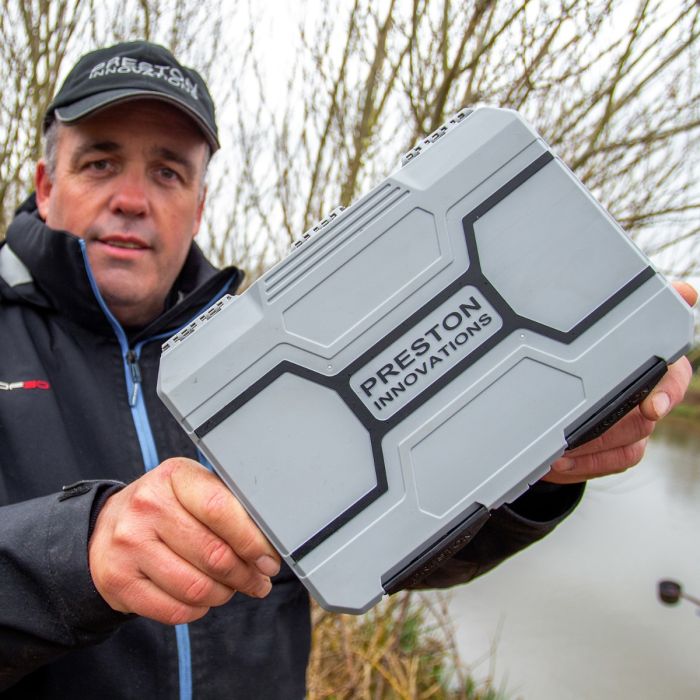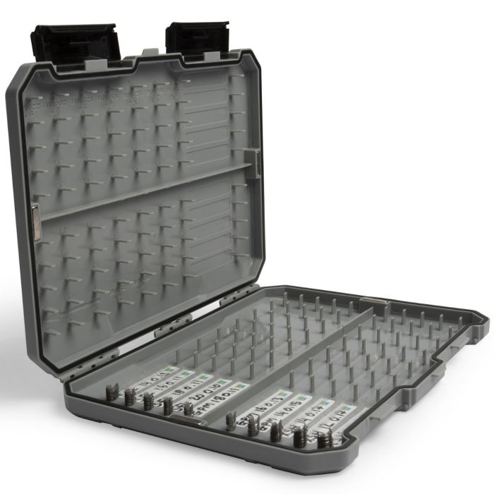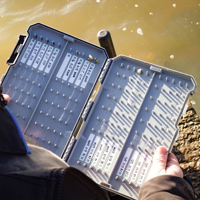 Die Universal-Vorfachbox eignet sich ideal zur Aufbewahrung zahlreicher Vorfächer in Längen von 7,5 cm bis 22,5 cm. Das Fassungsvermögen ist enorm, denn die Box verfügt über lange Stifte, die jeweils 20 Haken aufnehmen können.