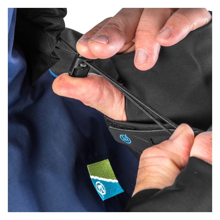 Die Jacke schützt vor Wind und Wetter mit einem hohen Halskragen, wasserdichten Reißverschlüssen, Knebelschnüren und versteiften Spitzenhauben. Sie hat auch Neoprenbündchen mit Daumenlöchern für Zugluftschutz.