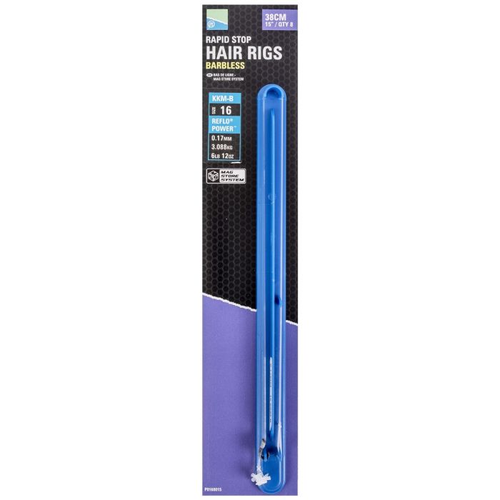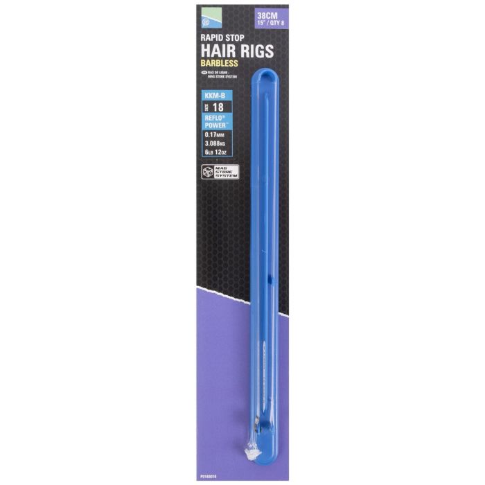 Für jedes Rig werden KKM-B-Haken verwendet, die an die bewährte Reflo Power-Schnur gebunden sind. Ein Rapid Stop vervollständigt das Vorfach, so ist es ideal als Haarmontage mit zahlreichen Ködern geeignet und die Länge von 38 cm ist ideal für das Anglen mit Standard-, Bomb-Feeder und Pellet Waggler Posen.