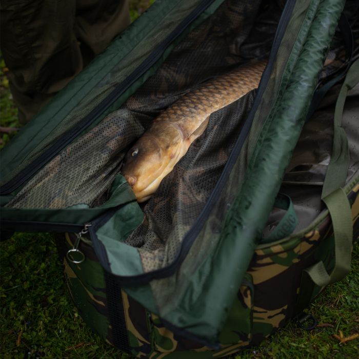 Dieser schwimmende Halteschlinge ist ideal, um die Fische für eine kurze Zeit auszuruhen, während Sie die Kamera und die Waage vorbereiten. Wenn Sie die Schlinge im Wasser in der Nähe befestigen, ist es für die Fische bequemer, als auf einer Aushakmatte oder einer Wiege auszutrocknen. Das Netzmaterial ermöglicht den Austausch von Wasser, das sowohl einströmt als auch ausströmt, damit diese sanften Strömungen den Karpfen trösten können. Das ultraweiche Tarnnetz schützt den Karpfen auch vor den unangenehmen Begleiterscheinungen der üblichen festen Schlingenmaterialien, lässt aber auch Schmutz, Ablagerungen und überschüssiges Wasser abfließen und ermöglicht so ein effektives Wiegen.