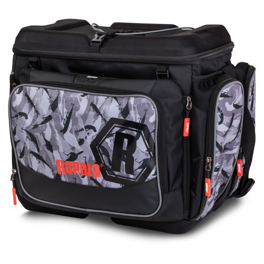 Waterproof Rapala LureCamo-printed fabric with molded, waterproof EVA bottom and lid to keep water out. Accommodates seven Rapala 356 Tackle Trays inside the bag plus on top for quick access. The multi-layer front pocket features secure tool storage that opens wide for easy access, zippered leader line dispenser pockets and organizer pockets. D-ring attachment points in the front. Zippered see-through pocket inside the lid. Neoprene panels on side pockets for extra capacity. End pockets double as rod holders. Padded, adjustable shoulder strap that can be pulled down to a top carrying handle. YKK zippers. Tackle boxes not included.