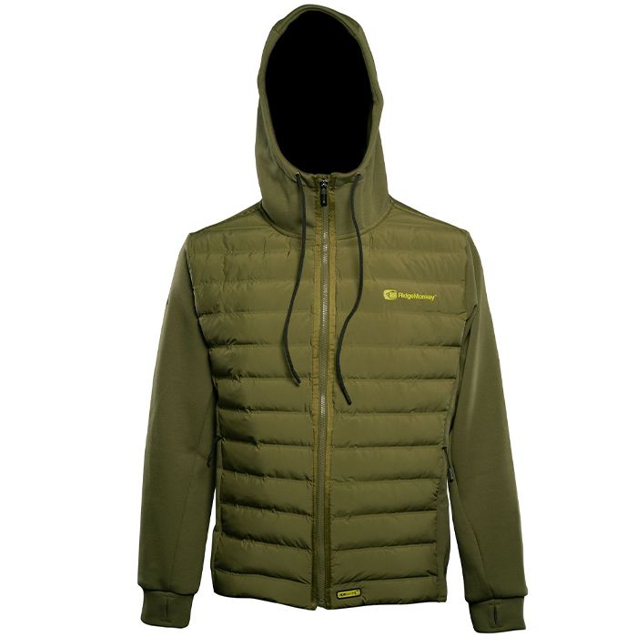 Die RidgeMonkey APEarel Heavyweight Jacke mit Reißverschluss erscheint in einem trendigen Grün und bietet ein synthetisches Daunenjackendesign. Die Jacke besteht aus einer Mischung aus 65% Baumwolle und 35% Polyester und verfügt über wasserabweisende Eigenschaften, die ideal für das Angeln Im Frühling und Herbst sind.