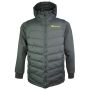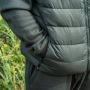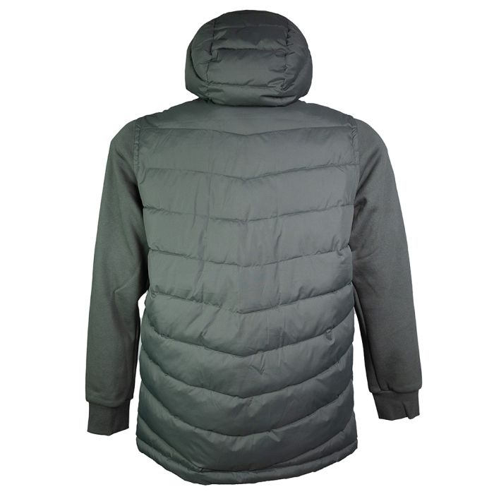Das Hauptteil ist mit einer synthetischen Daune gepolstert, die warme Luft zwischen den Fasern einschließt und so dafür sorgt, dass Ihr Rumpf isoliert bleibt. Die verstellbare, hochgeschlossene, muschelartige Kapuze bietet zusätzlichen Schutz vor den Elementen. Der durchgehende Frontreißverschluss ermöglicht es, diesen Mantel schnell an- oder auszuziehen, und verfügt über eine Sturmklappe, die hilft, Kälte abzuhalten. Elastische Kordelzüge am Kragen und Saum ermöglichen es, den Mantel an Ihre Bedürfnisse anzupassen. Die Arme bestehen aus einem technischen Baumwoll/Polyester-Gewebe, das die perfekte Mischung aus Wärme und Komfort bietet. Die elastischen Ärmel mit Daumenlöchern sorgen für eine sichere, bequeme Passform und halten Zugluft fern. Eine Brusttasche mit Reißverschluss sowie zwei seitliche Reißverschlusstaschen bieten reichlich Platz, um Ihre wichtigen Dinge zu verstauen.