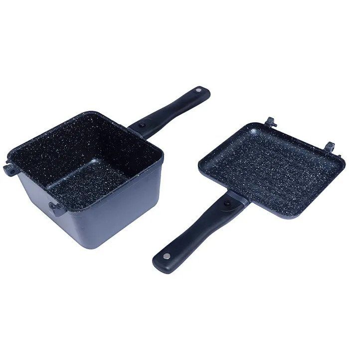 Die Connect Deep Pan & Griddle Granite Edition verfgt ber abnehmbare Cool-Touch-Griffe und ein abnehmbares Scharniersystem, das eine Pfanne in zwei verwandelt einen Topf mit tiefen Seiten und eine separate Grillpfanne. Die Grillpfanne fungiert als Deckel auf der tieferen Pfanne und kann abgenommen werden, um eine separate Pfanne zu werden, sodass Sie zwei Portionen gleichzeitig zubereiten knnen. Die Grillpfanne ist auch mit dem RidgeMonkey Connect Sandwich Toaster Granite Edition austauschbar. Unsere brandneue Beschichtung im Granit-Stil macht unsere Pfannen robuster, langlebiger und bietet verbesserte Antihaft-Eigenschaften, die kompaktes Kochgeschirr auf ein ganz neues Niveau heben. Erhltlich in Standard- und XL-Gren.