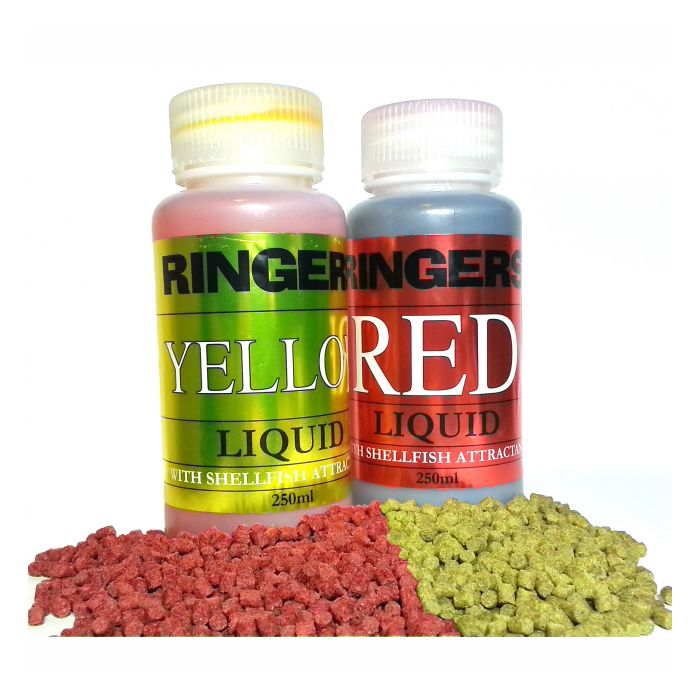 Das allseits beliebte Ringers-Red Flüssigfarbstoff wurde neu aufgelegt und wird nun durch eine gelbe Version ergänzt. Diese enthalten ein Muschel Lockmittel und eignen sich perfekt zum Färben aller Köder, einschließlich Pellets, Fleisch, Mais, Brot, Grundfutter usw.