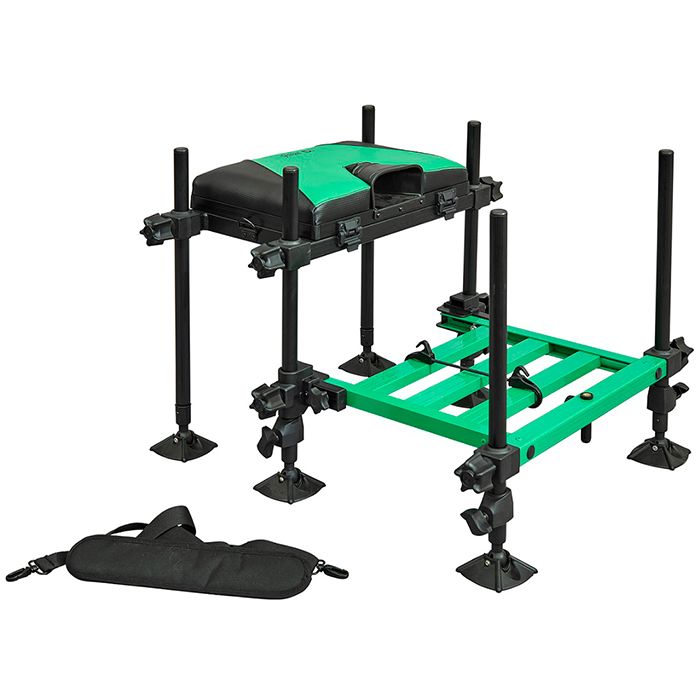 Kompakte und leichte Sitzbox, perfekt für kurze Sessions. Geliefert mit 4 Standard 25mm Beinen, einer Fußplatte und einem abnehmbaren und verstellbaren bequemen Schultergurt.