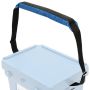 Dieser Gurt hat einen großen, blau gepolsterten Abschnitt, der Bequemlichkeit und Unterstützung beim Tragen auf der Schulter bietet. Die beiden Enden der Gurte lassen sich an beiden Seiten der Box in einen Spalt einstecken, und die Gurte können ebenfalls verstellt werden.