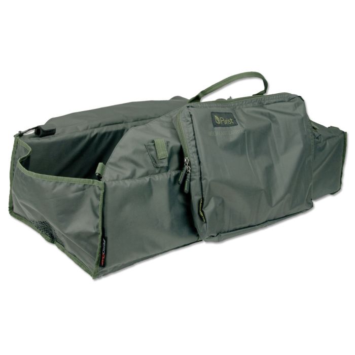 Shimano Purist Weigh Mat: A weigh sling with a difference, this innovative product can be clipped onto the AQS (Aero Quiver System) to provide additional storage in transit. These items can be organised utilising the bankstick/pod pocket or the large terminal tackle accessory pocket. It can also be wrapped around reels on the AQS to provide additional protection to non sleeved reels and line. In use the mat folds out for safe unhooking of fish and then folds back for weighing and release.