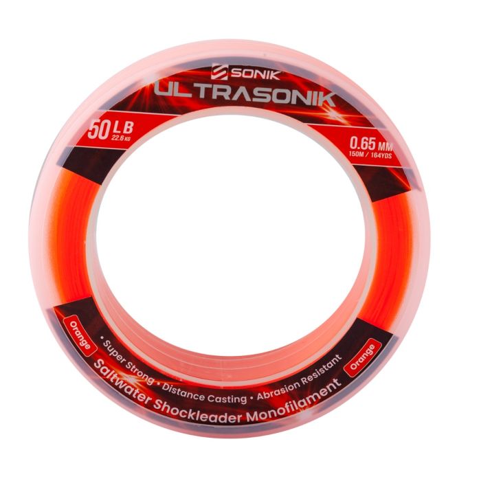 Das Ultrasonik Shock Leader Vorfachmaterial wurde zur Ergänzung der Ultrasonik Salzwasser-Monofilschnur entwickelt und bietet eine starke und zuverlässige Federung beim Weitwurf. Diese Schnur wird auf einer 150 m langen Handgelenkspule geliefert und ist in zwei Farbtönen erhältlich: transparent und orange. Es ist superstark und sehr abriebfest und damit die ideale Wahl für das Angeln auf unebenen Böden.