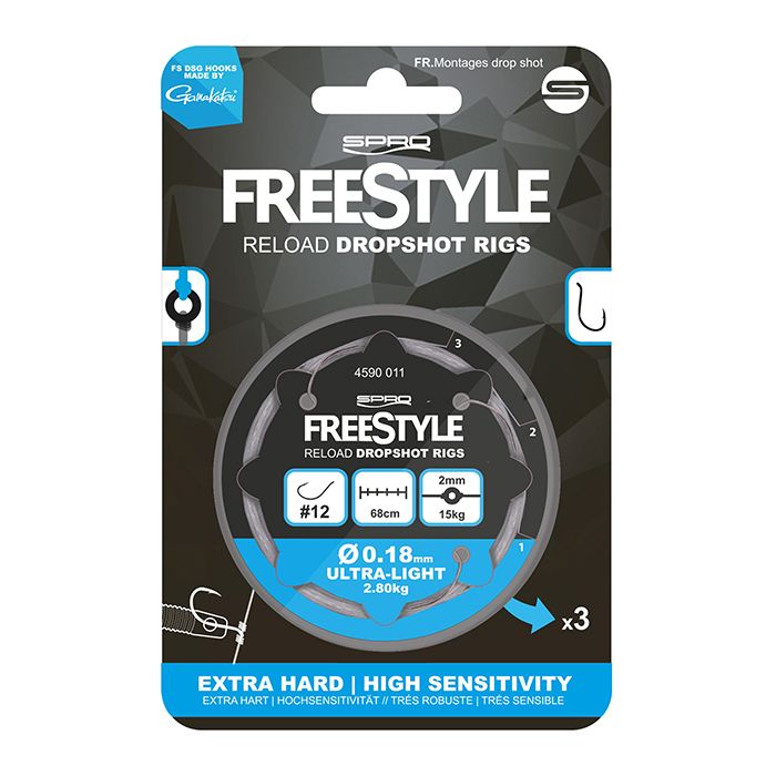 Die Spro Freestyle Reload Dropshot-Rigs sind vormontierte Dropshot-Rigs mit unseren Gamakatsu DSG-Haken. Binden Sie einfach den Verbindungsring an die geflochtene Schnur und fügen Sie einen FS Pear Sinker in der erforderlichen Tiefe hinzu. Schnell und einfach!