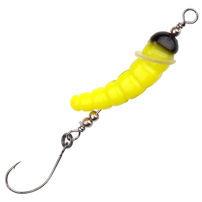Dieser sinkende Forellenköder ist die natürliche Imitation einer Insektenlarve. Die eingebaute Lippe bietet eine attraktive Aktion mit minimalem Aufwand. Fischen Sie einfach im Köder und variieren Sie die Geschwindigkeit. Die Einzelhakenversion ist für die meisten Forellenseen geeignet, in denen Drillinge normalerweise verboten sind.