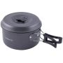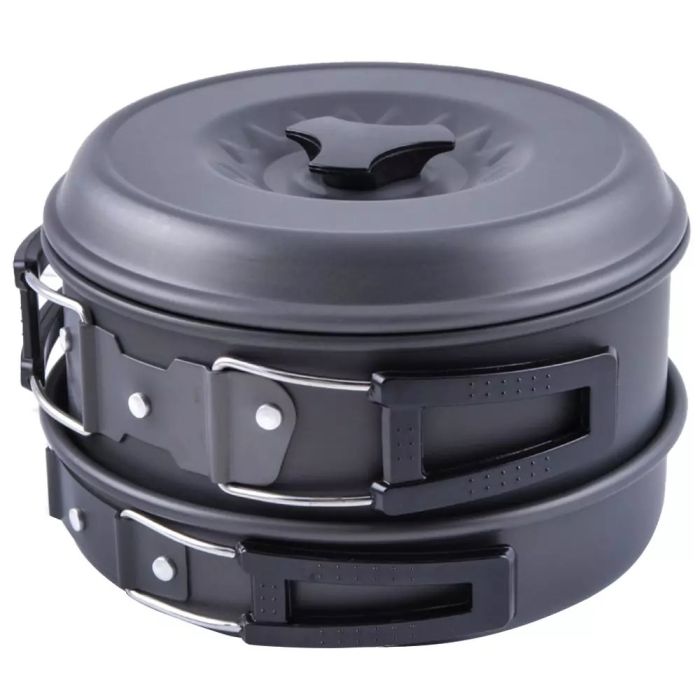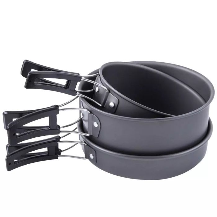 Das dreiteilige Armolife Kochgeschirrset mit Pfanne, zwei Töpfen mit Deckel wiegen nur 746 g und ist dank seiner leichten Aluminiumeigenschaften und der Eloxierung, super kompakt. Er wird in einer Netz-Tasche geliefert und hat hitzebeständige, klappbare Griffe, die ihn noch staufreundlicher machen, denn Sie passen bequem ineinander.