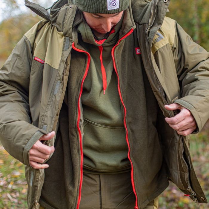 Eine Fleece Jacke zum Auszippen gibt Ihnen volle Saisonflexibilität, d.h. die Auswahl um die Fleecejacke bei schönem Wetter zu entfernen, wenn die zusätzliche Schicht unnötig ist, während es Sie selbst im kältesten Winter warm hält. Die Taschen in der Jacke und Hosehabe auch Reißverschlüsse und sind mit Fleece im Inneren gefüttert, sodass Sie schmerzende Finger rasch aufwärmen können, um schnell und reibungslos auf jede Aktion während der Session reagieren zu können, Zudem sind die Taschen für die kälteempfindliche Elektronik auch praktisch, wenn Sie an einem bitterkalten, düsteren Ufer im Winter angeln. Mit einer verstellbaren Taille, einem verstellbaren Saum und verstärkten Kniebereich ist dieser 100 % Polyester-Multi-Anzug mit einer 5000 mm Wassersäule, bequem, langlebig und praktisch, ganz gleich, unter welchen Bedingungen und wie lange Sie angeln.