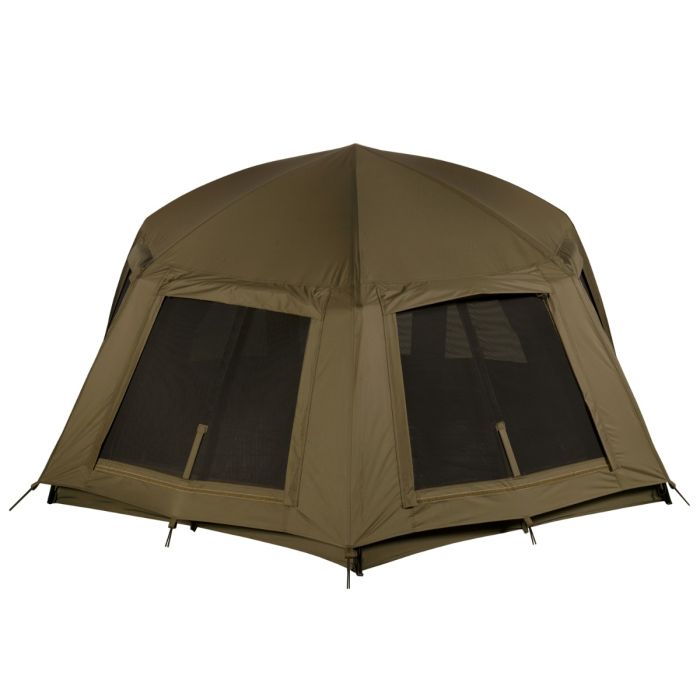 Die Montage ist in Sekundenschnelle erledigt. Das Skull Cap Wrap wird einfach mit Heringen um das Bivvy herum angebracht und vorne am Zelt mit 3 Stangen befestigt. Die hinteren Fenster entsprechen denen des Bivvys und lassen bei wärmerem Wetter die Luft zirkulieren, wodurch das Zelt kühler bleibt. Die Hülle hat vorne eine Regenrinne und zwei Rutenhalterungen mit Klettverschluss.