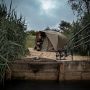 Die Montage ist in Sekundenschnelle erledigt. Das Skull Cap Wrap wird einfach mit Heringen um das Bivvy herum angebracht und vorne am Zelt mit 3 Stangen befestigt. Die hinteren Fenster entsprechen denen des Brollys und lassen bei wärmerem Wetter die Luft zirkulieren, wodurch das Zelt kühler bleibt. Die Hülle hat vorne eine Regenrinne und zwei Rutenhalterungen mit Klettverschluss.