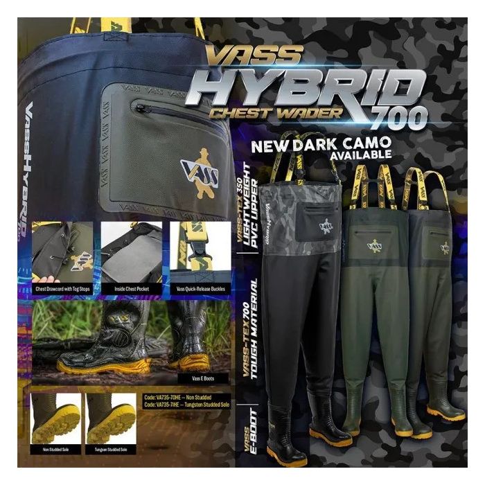 Whether you're an experienced angler or just starting out, the Vass Hybrid 700 Dark Camo Chest Wader Non-Studded provides an unmatched combination of stealth, comfort, and robustness.